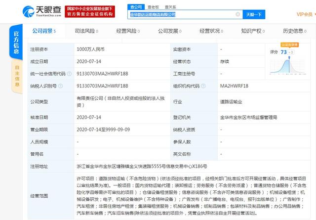 金华韵达运乾物流有限公司成立于7月14日,注册资本是1000万,公司经营范围是道路货物运输、国内货物运输代理;装卸搬运;劳务服务等。公司法定代表人是丁敬保。