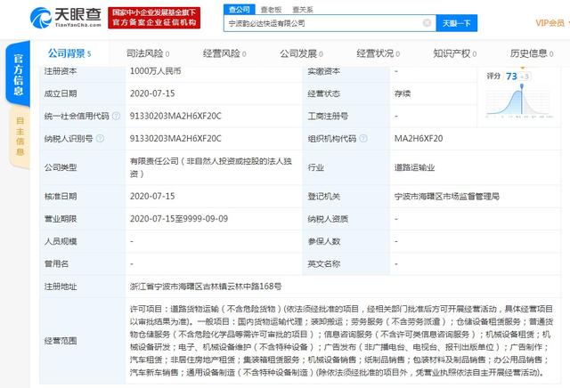 宁波韵必达快运有限公司成立于7月15日,注册资本是1000万,公司经营范围是道路货物运输、国内货物运输代理;装卸搬运;劳务服务等。公司法定代表人是乔柏洪。