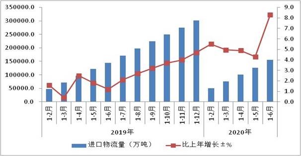 进口物流需求量显著增长。上半年,国内疫情防控形势向好,我国率先推动企业复工复产,支撑进口物流需求企稳回升,货物贸易进口量增长8.3%,增速比1-5月份提高4个百分点。主要货类中,大宗商品和重点农产品进口量均有所增加。进口铁矿石增加9.6%;进口煤增加12.7%;进口大豆增加17.9%;进口牛肉增加42.9%;进口猪肉增长1.4倍。